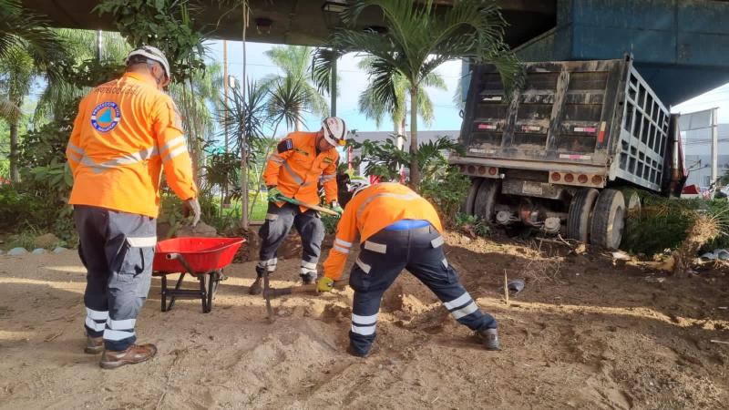 Problemas mecánicos provocaron que el vehículo pesado se subiera a la zona verde debajo del paso a desnivel se llevara varias plantas y se estrellara en una de las bases.